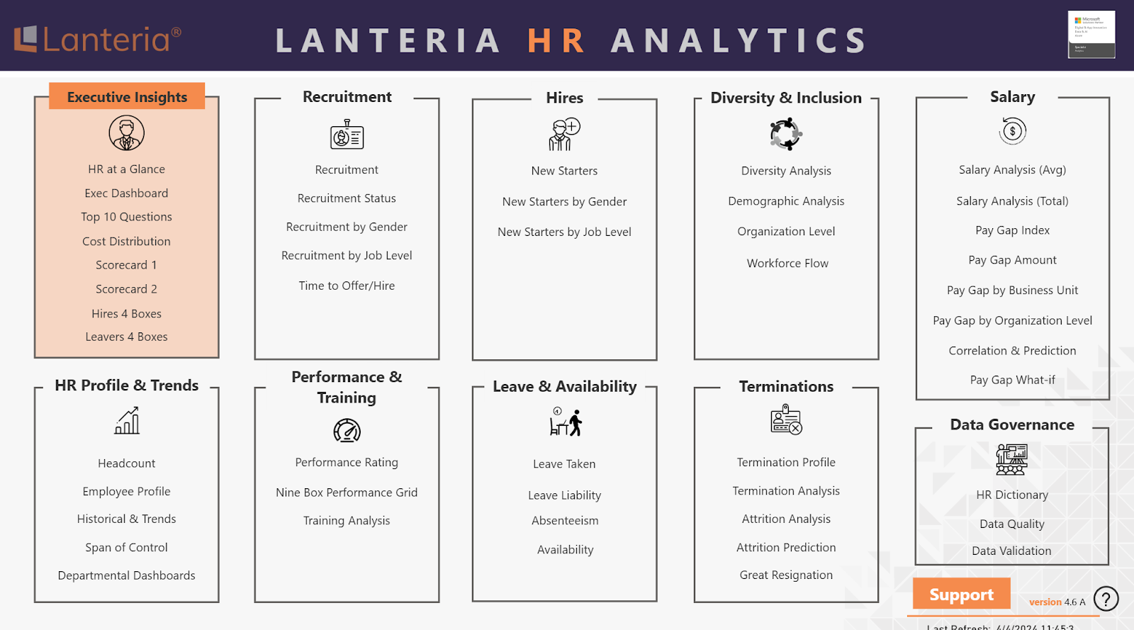 The Lanteria Analytics Dashboard Suite enables HR to transition from a reactive to a proactive strategy. It is naturally integrated with Microsoft 365 and Power BI, and includes a secure, scalable platform.